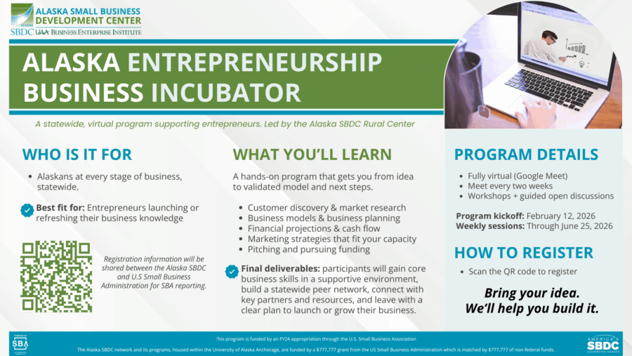 The Alaska Small Business Development Center (SBDC) Rural Center at the University of Alaska Anchorage is launching the Alaska Entrepreneurship Business Incubator Program, a five-month, statewide, virtual program designed to support Alaskans at any stage of their business journey.